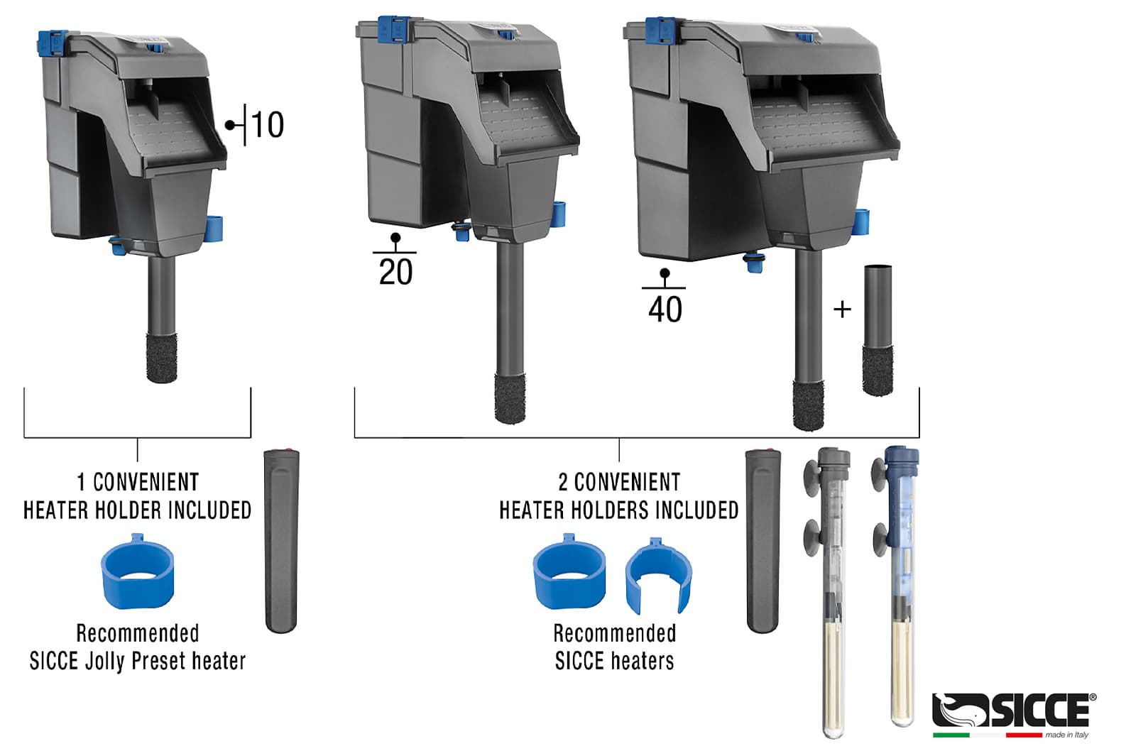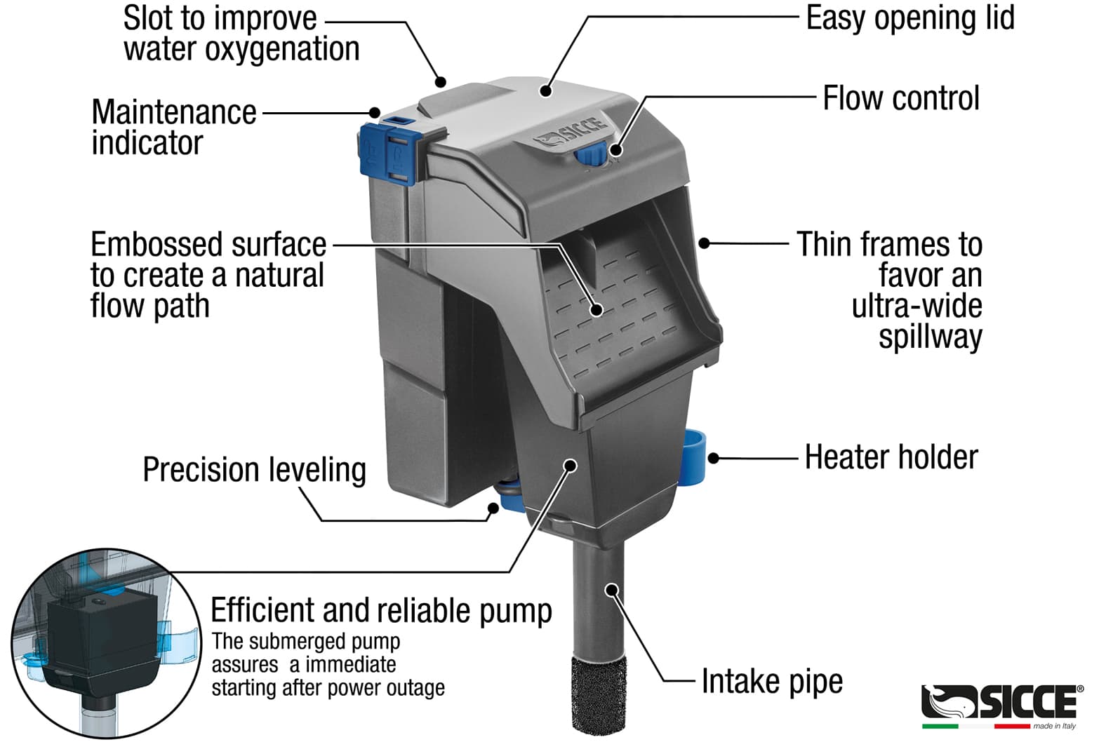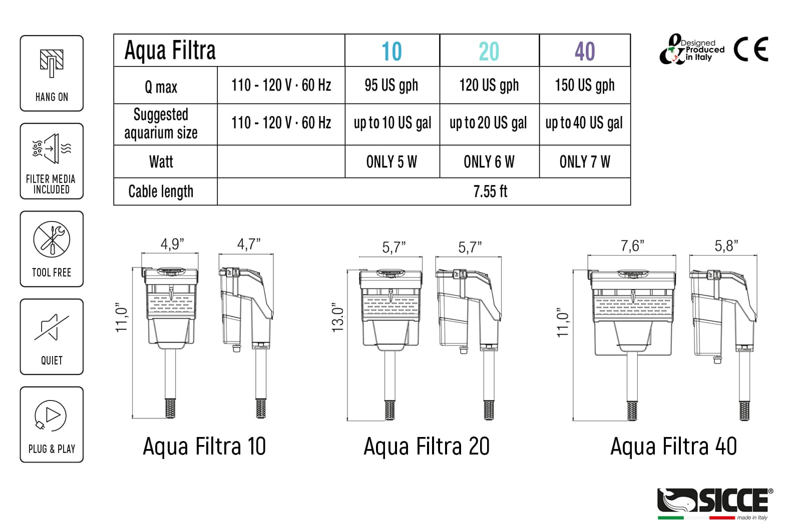 AQUA FILTRA is the perfect solution for anyone looking to keep their aquarium water clean, healthy, and perfectly balanced—with minimal effort. Proudly designed and manufactured in Italy, this filter showcases SICCE’s renowned expertise: a perfect blend of style, reliability, and long-lasting performance. With its smart, compact design, AQUA FILTRA fits seamlessly into any aquarium setup, deliveringpowerful performance while remaining easy to install and maintain. Built from high-quality materials, it ensures durability and efficiency, making it a smart investment for both first-time aquarium owners and experienced aquarists seeking simplicity without compromising results.
