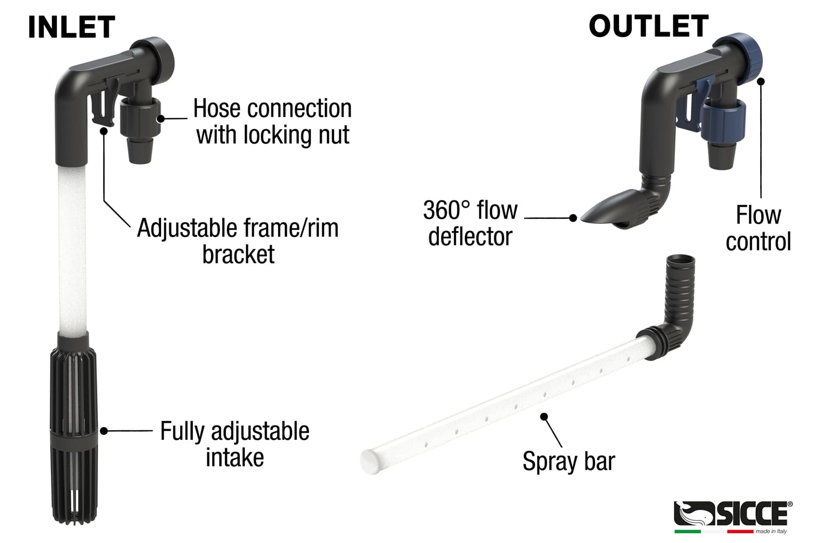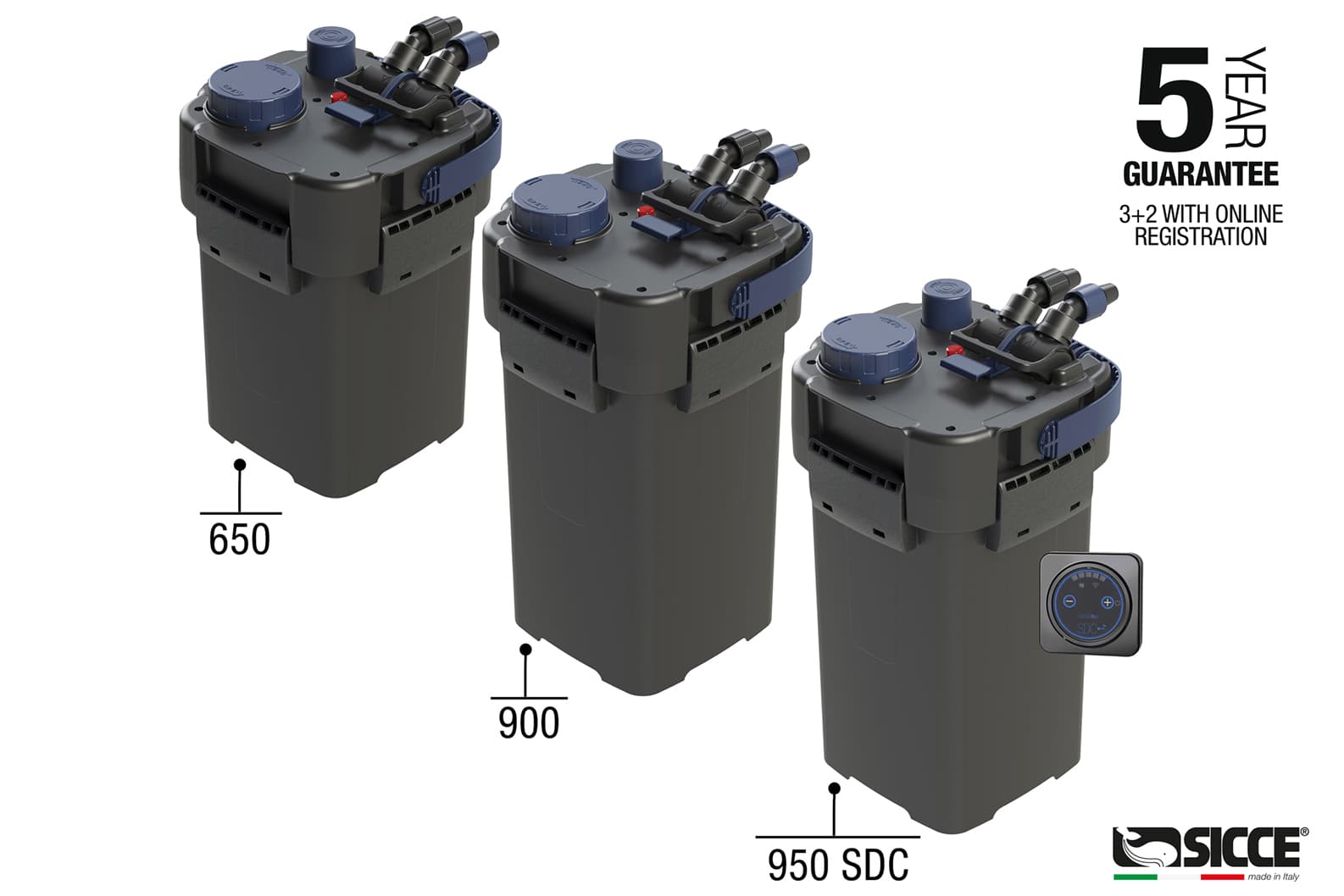 The filters in the MEGA FILTRA line, entirely Made in Italy, offer efficient filtration, quiet operation and long life. Equipped with a practical priming mechanism, they guarantee easy start-up and maintenance. Availablein three models for aquariums up to 950 litres, they are suitable for both freshwater and marine aquariums. Thanks to the adjustable water flow,they promote proper circulation and oxygenation of the water inside the tank. Supplied complete with high-quality SICCE filter materials (sponges,HYPERCARBO, HYPERZEO, BIOKER, AQUAMAT) and accessories for quick and safe installation.